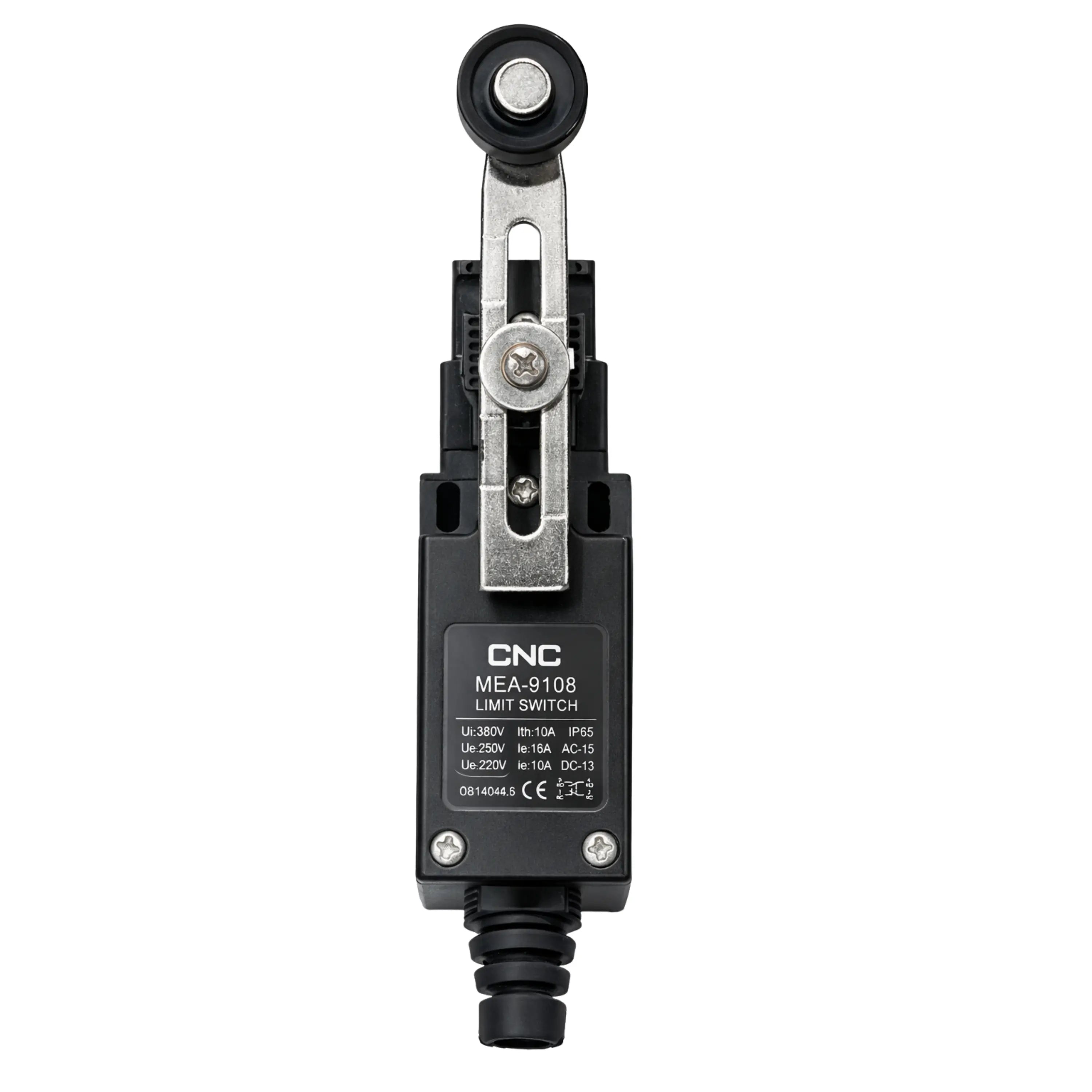 CNC Electric MEA-9108 Limit Switch is a high-performance industrial position control switch designed for accurate mechanical position detection in automation systems. Based on the images, this model features a metal roller lever actuator, rugged thermoplastic housing, and IP65 protection rating — making it ideal for demanding industrial environments.